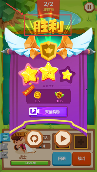 4、達(dá)成【勝利】后可獲得85金幣與105經(jīng)驗(yàn),選擇【雙倍獎(jiǎng)勵(lì)】可觀看視頻獲取更多資源。