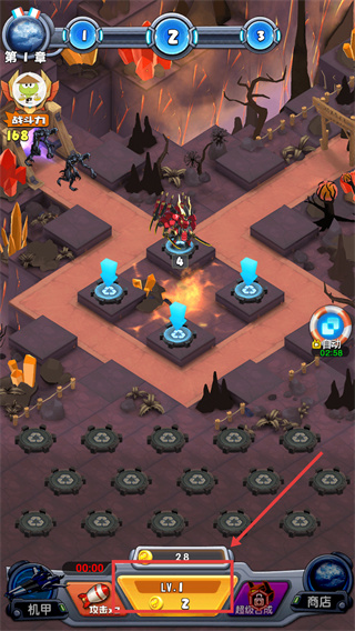 1、進(jìn)入關(guān)卡后,先通過【機(jī)甲】功能查看當(dāng)前戰(zhàn)力,積累金幣升級【LV.1】機(jī)甲。