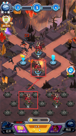 2、戰(zhàn)斗中可將同等級機(jī)甲合成更高等級,提升戰(zhàn)力應(yīng)對敵人,同時(shí)激活【收益×2】功能獲取更多金幣資源。