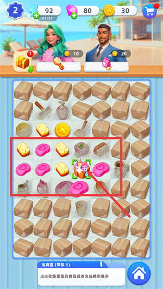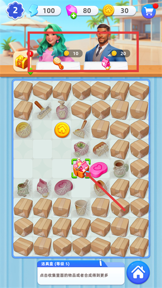 1、采用合并升級玩法,將兩個相同的物品合并,即可獲得更高級的物品,高級物品不僅實用性更強,還能為房屋裝修提供更多優(yōu)質選擇。