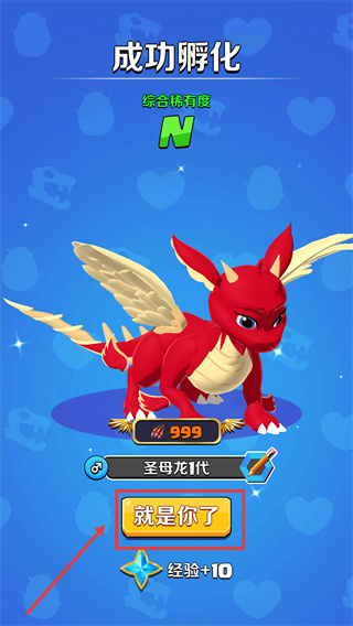 2、龍蛋孵化出【圣母龍1代-N級】,點(diǎn)擊【就是你了】將其加入陣容,孵化可獲育龍師經(jīng)驗(yàn)。
