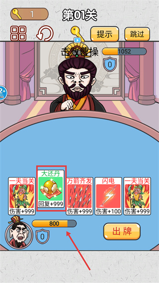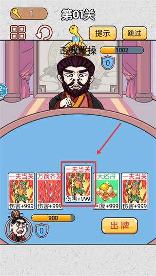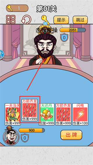 2、【第01關(guān)】中優(yōu)先選擇標紅的【萬箭齊發(fā)】卡牌,其【傷害+999】效果可快速削減敵方血量。