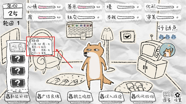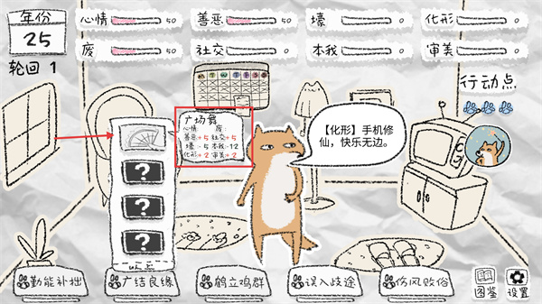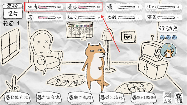 2、進(jìn)入關(guān)卡后,關(guān)注標(biāo)紅的【心情】【善惡】等屬性條(初始值均為50),后續(xù)行動會影響這些屬性的變化。