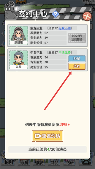 2、在簽約界面選擇資質(zhì)合適的演員,點擊【簽約】按鈕,擴(kuò)充演員團(tuán)隊以解鎖更多收益途徑。
