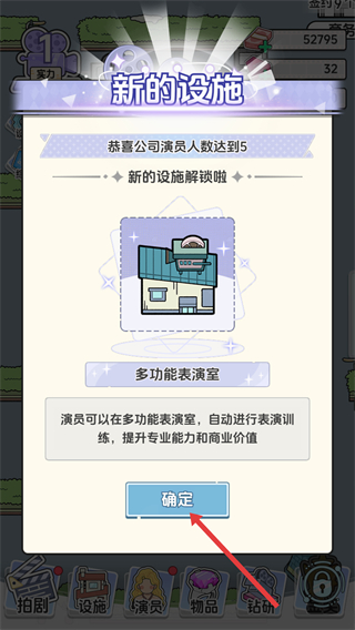 3、演員人數(shù)達(dá)5時解鎖【多功能表演室】,點擊【確定】獲取該設(shè)施,助力演員提升能力。