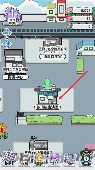 4、利用【多功能表演室】讓演員進(jìn)行訓(xùn)練,提升其能力后可接更多資源,增加收益來源。