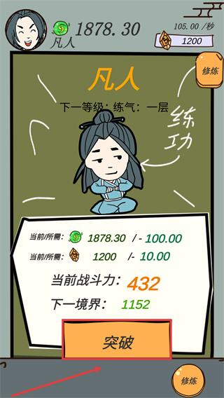1、當(dāng)資源滿足【當(dāng)前/所需】條件時(shí),點(diǎn)擊【突破】按鈕提升境界,解鎖更高戰(zhàn)斗力與新玩法。