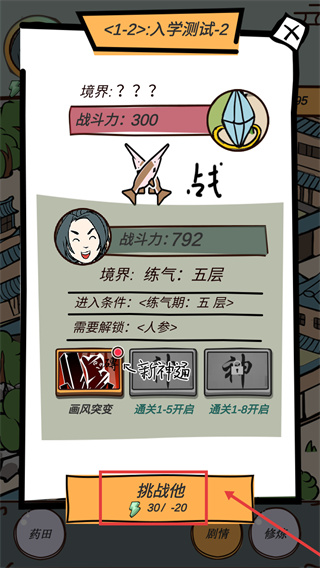 2、滿足【進(jìn)入條件-練氣期-五層】后,點(diǎn)擊【挑戰(zhàn)他】參與關(guān)卡,消耗資源獲取通關(guān)獎勵(lì)。