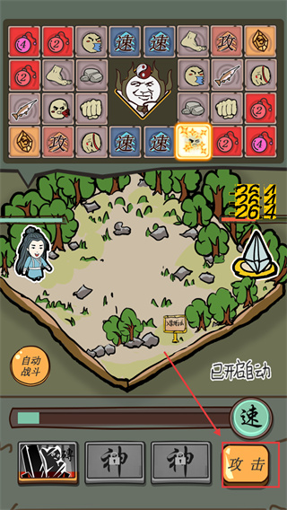3、戰(zhàn)斗中點(diǎn)擊【攻擊】按鈕釋放技能,配合已裝備的神通卡牌,快速提升輸出效率。