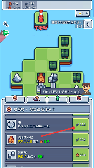 1、在建造界面選【路】,消耗【12.8】資源,將伐木小屋和工廠連接,搭建基礎生產運輸線路。