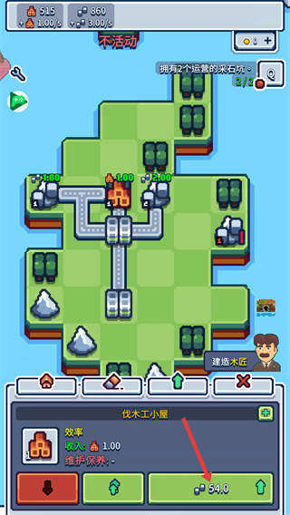 4、查看【伐木小屋】的【效率-1.00】,點擊對應按鈕升級設施,提升資源產出效率來增加收益。