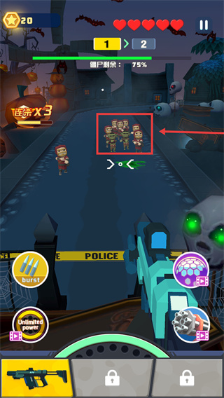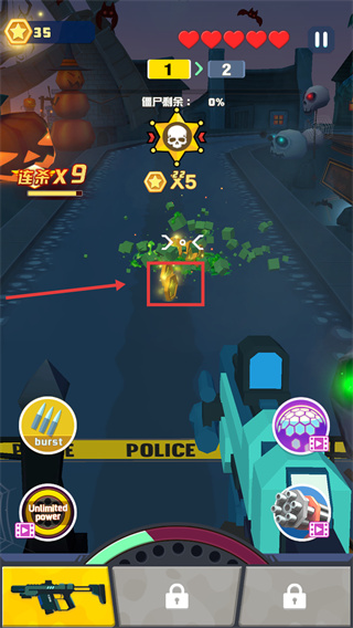 2、戰(zhàn)斗中瞄準(zhǔn)密集的僵尸群體射擊,積累【連殺】進(jìn)度。