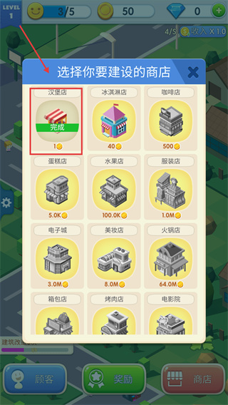 2、建設(shè)商店時(shí)先選【漢堡店】,其僅需【1金幣】即可解鎖,能快速投入運(yùn)營(yíng)獲取初始收益。