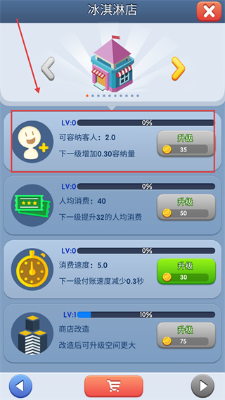 3、升級(jí)【冰淇淋店】?jī)?yōu)先提升【可容納客人】屬性,花費(fèi)【35金幣】升級(jí)可增加客流承載量,助力收益增長(zhǎng)。