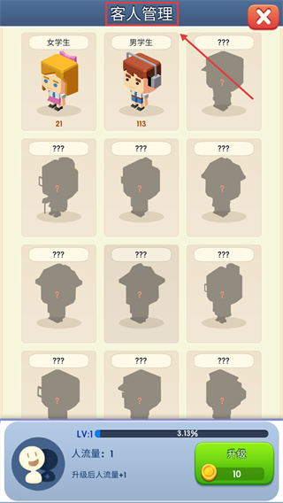 4、在【客人管理】界面,花費(fèi)【10金幣】升級(jí)人流通量,可解鎖更多客群類型,提升店鋪的消費(fèi)轉(zhuǎn)化效率。
